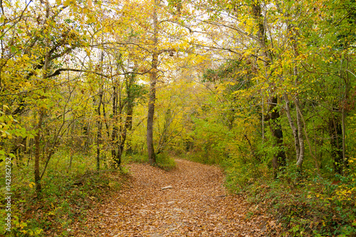forest, path, root, tree, branch, grass, bush, leaf, yellow, green, autumn, horizontal, landscape