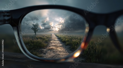 landscape, path, tree, serene, view, pair, glasses, depict, lead, distant, balance, courage, insight, road, depth, success, effort, space, outcome, journey, sharpened, cloudy, vision, clear, value