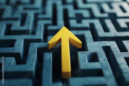 arrow, labyrinth, labyrinth, path, success, challenge, solution, direction, guidance, progress, goal, objective, strategy, planning, route, way, journey, destination, future, ambition, achievement, opportunity, growth, advancement, development, ascent, climb, elevation, apex, summit, top, high, upward, yellow, blue, three-dimensional, render, image, graphic, design