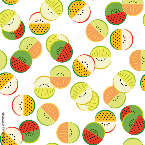 pattern, shape, detail, bright, fruit, food, snack, treat, health, lifestyle, watermelon, apple, red, green, sunflower-seed, kiwi, orange, mandarin orange, melon, tasty, flat, colours, design, idea, icon, piece, part, seamless, many, quantity, decoration, white, background