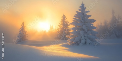 The peaceful stillness of a winter wonderland at sunrise, where the fresh snow and soft light create a tranquil winter scene