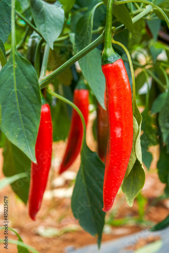 The pepper trees on the farm are full of Chili pepper fruits, red pepper