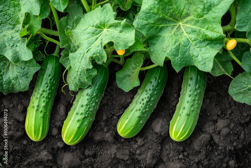 The photo capturing fruit-bearing plants and vegetable garden thriving in dark soil. Each plant is depicted with its full fruits