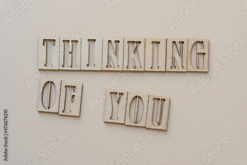 the phrase "thinking of you" in wooden stencil font on paper