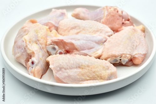 The picture shows chicken meat, wings, cut into pieces and placed on a plate.