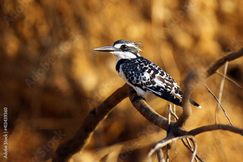 The pied kingfisher (Ceryle rudis) sitting on a branch with a golden yellow background due to the setting sun. Black and white kingfisher on a yellow background.