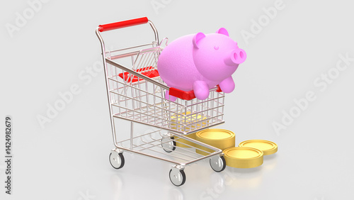 The Pink piggy bank in Shopping cart for Marketing concept 3d Rendering.