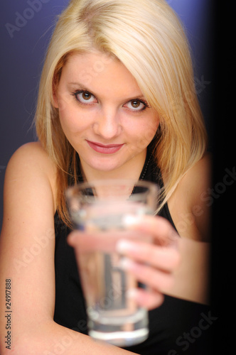 woman, young, girl, blond, pleasing, beautiful, lovely, hair, loose, flowing, brown, eye, brown-eyed, seductive, decoration, deliciously, appealing, gem, inviting, desirable, alluring, enticing, grey, grey, background, smile, shiny, lustrous, shine, luster, water, glasses, drinking, thirst