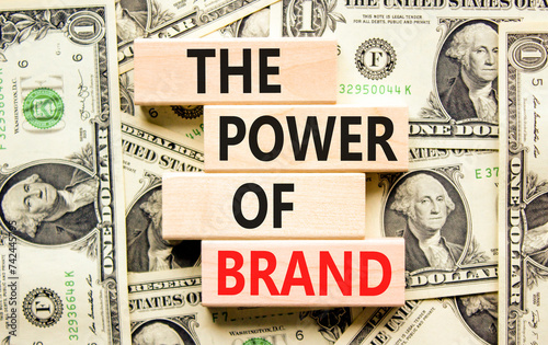 The power of brand symbol. Concept words The power of brand on beautiful wooden block. Beautiful dollar bills background. Dollar bills. Business the power of brand concept. Copy space.