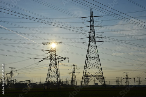 station, structure, substation, sky, resource, outdoors, sundown, supply, voltage, wire, work, volt, transmission, technology, tower, transformer, metal, pylon, energy, engineering, equipment, distribution, colours, danger, facility, electricity, evening, infrastructure, twilight, electric, sunset, dusk, cable, supplying