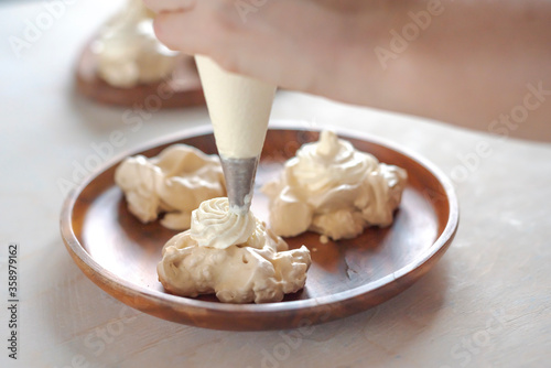 the process of creating Pavlova dessert, decorating the meringue with cream from the culinary bag
