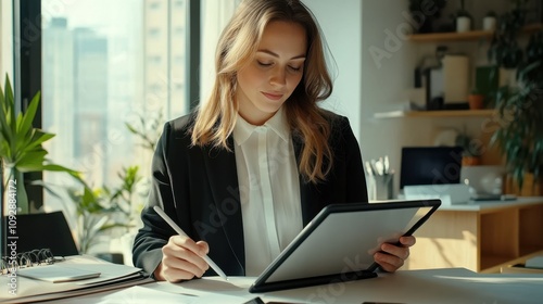 office, woman, business, tablet, writing, professional, workspace, technology, sharpened, working, landscape, urban, modern, organised, creativity, lifestyle, career, concentration, entrepreneurship, presentation, smart, casual attire, elegant, indoor, daylight, foliage, corporate, productivity, etiquette, research, planning