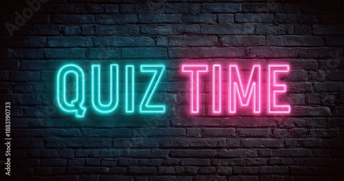 neon, signs, quiz, time, glowing, brick wall, brick, background, retro, vintage, colourful, cyan, pink, magenta, typography, message, announcement, entertainment, contest, night, illuminated, light, advertisement, signage, modern, urban, interior, club, party, celebration, promotion, banner, poster, design, headline, dark, concept, wide