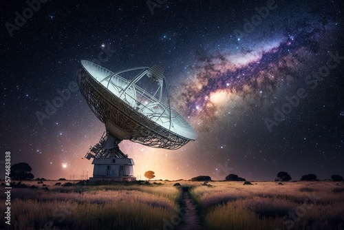 The radio telescopes on the Dawn Grassland, with starry sky in the background. AI technology generated image