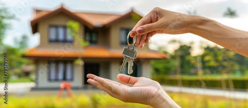 The real estate agent giving keys to buyer. Close-up of hands on background of new house. Creative banner of real estate agency, mortgage, copy space.
