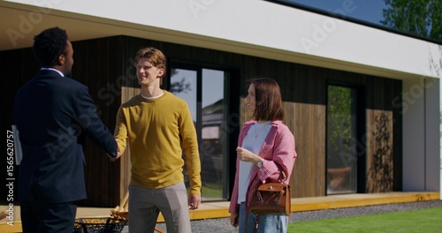 realtor, house, real estate, buyer, client, couple, family, husband, wife, talking, greeting, outdoors, business, businessman, property, bungalow, row house, man, seller, summer, day, daylight, racked, people, work, service, african american, young, horizontal