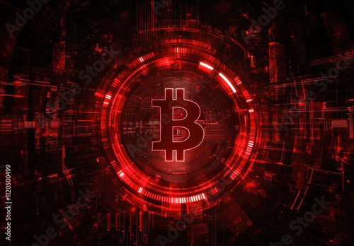 The red digital Bitcoin logo is placed on an abstract, futuristic background.