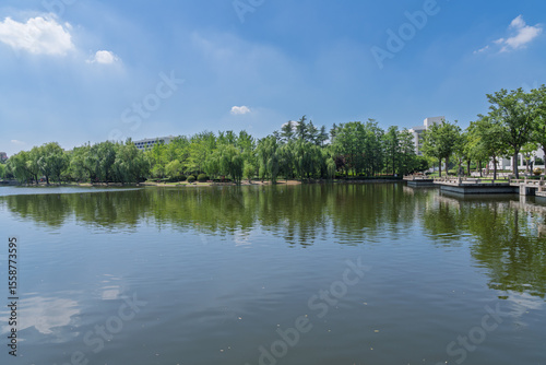 nature, tree, terrain, natural beauty, scenery, sky, calmness, lake, water, daytime, cloud, wood, blue skies, white cloud, park, willow, water surface, city landscape, leisure, green, ecology, waterscape, vacation, freshness, tour tourism, landscape, river, summer, forest, blue, tree, cloud, grass, outdoors, sun, scene, beautiful, panorama, scenic