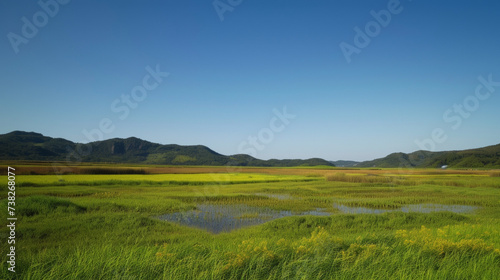 The rich emerald color of the paddies is a sight to behold contrasting beautifully with the clear blue sky above.