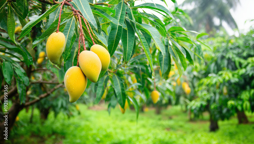 the ripe mangoes hanging from the branches in an orchard look delicious, with their golden yellow skin and juicy texture.