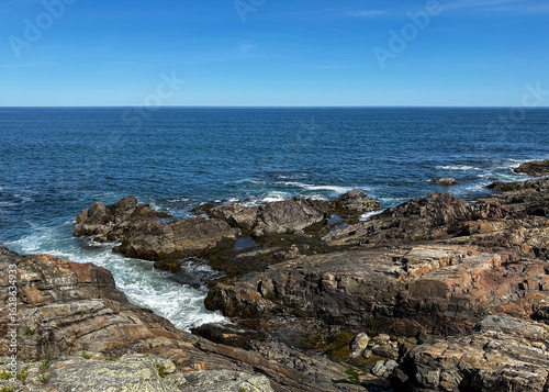 The rocky coast along Marginal Way in Ogunquit, Maine, on a beautiful summer day with a blue sky and blue water