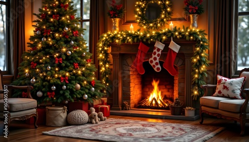room, festive, ambience, bathe, warm, glow, twinkling, miniature, light, draped, across, verdant, conifer, garland, fragrant, evergreen, bough, ornamented, mantel, crimson, ribbon, shimmering, ornament, plush, patterned, rug, anchor, space, supply, soft, contrast, polished, hardwood, floor, stocking, various, texture, pattern, hang, their, top, woolen, pom, hearth