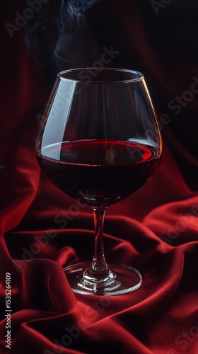 The scene is set against a minimalist, monochrome background with a vertical gradient of wine red, featuring a glass of red wine and smoke
