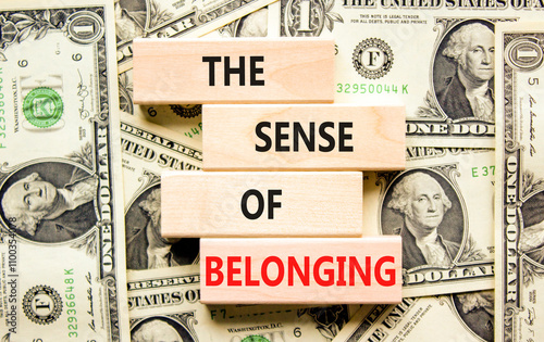 The sense of belonging symbol. Concept words The sense of belonging on beautiful wooden blocks. Beautiful background from dollar bills. Business and the sense of belonging concept. Copy space.