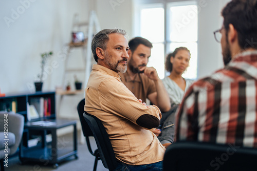 woman, man, mature, people, sitting, talking, concentrated, listening, focused, circle, indoor, adult, listen
