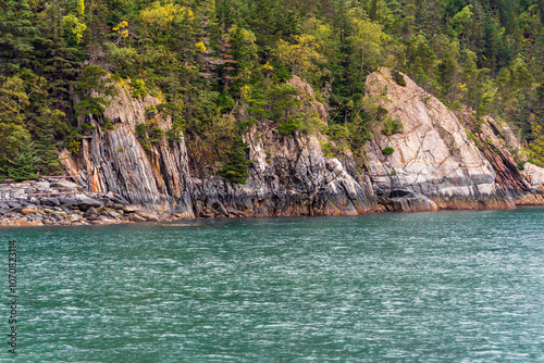The shoreline with trees, rocks, and sea water on the Chilkoot Inlet near Skagway, Alaska