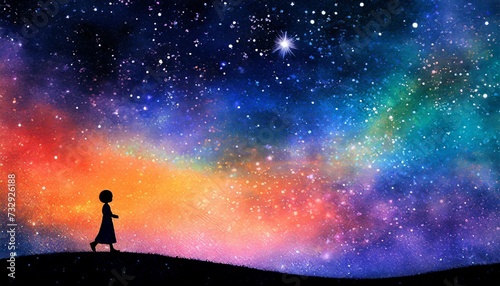 The silhouette of a girl walking under a night sky illuminated by the aurora.