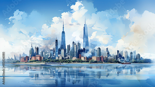 skyscraper, oil painting, skyline, artistic, building, city landscape, metropolis, architecture, river, blue color, evening, cultural, tranquil, water, lake, city landscape, waterfront, cloud, urban, sky, abstract painting, state, famous, majestic, calm water, mirror, urbanism, heaven, development, downtown, modern, empire, canvas, light, fluid, business