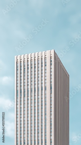 The sleek, modern skyscraper boasts a glass facade and stands out against a clear blue sky, epitomizing contemporary urban design and architecture