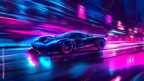 The sleek silhouette of a sports car driving through a futuristic cityscape at night