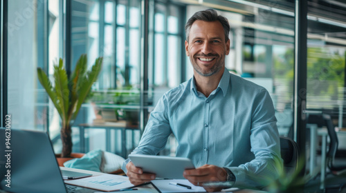 business, laptop, man, office, work, technology, workspace, nature, happy, casual attire, success, professional, smile, tablet, confident, modern, plant, window, digital, desk, indoor, corporate, executive, productivity, light, entrepreneur, sitting, software, leadership, informal