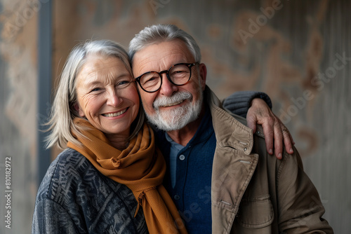 The smiling elderly couple looks together in the photo, exuding love and joy, emphasizing their long-term relationship and mutual support.