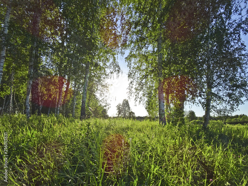 The summer landscape is a birch grove at sunset of the day. Sun rays beautifully illuminate the forest.