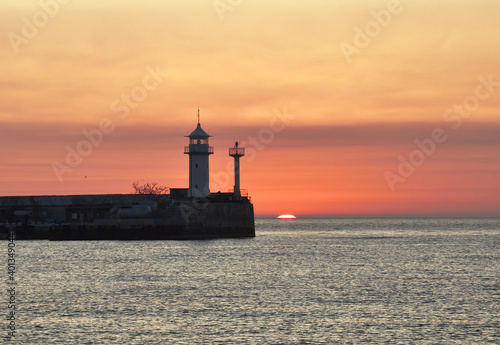 lighthouse, sea, sunset, water, sky, ocean, tour tourism, travel, trip, resort, yalta, crimea, russia, beach, summer, sun, light, port, silhouette, orange, sunrise, harbor, landscape, blue, cloud, horizon