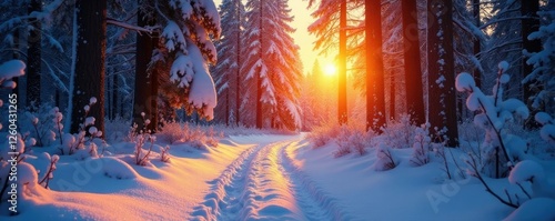 The sun rises over a snow-covered forest, casting long shadows, winter woods, warm light