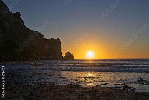 sunset, sea, sky, water, ocean, beach, sun, coast, landscape, rock, dusk, coastline, travel, seascape, shore, evening, orange, wave, california