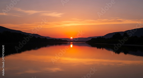 The sun sets over the tranquil river, casting a warm orange glow across the water and silhouetting the trees and hills on either side