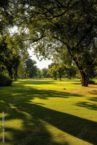 The sun shines through trees, casting shadows on the grass