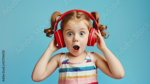children, children, technology, fashion, girl, surprise, happy, cheerful, bright, youth, cute, earphones, studio, red, face, fun, expression, excited, childhood, modern, colourful, listening, audio, emotion, blue, adorable, music, striped, joyful, isolated, playful, sound, trendy, enjoyment, enthusiastic, posing, astonished, energetic, whimsy, innocent, moment, loud