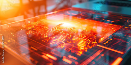 hologram, desk, peaceful, technically, advanced, city, image, semitransparent, projection, utopia, digital, holographic, sunrise, synthetic, futuristic, modern, sleek, professional, vibrant, interactive, educational, engaging