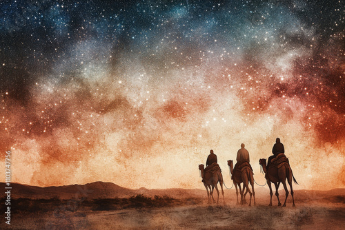 three, their, camel, traveling, desert, way, bethlehem, scene, captured, beautiful, watercolor, style, huge, landscape, starry, sky, overhead