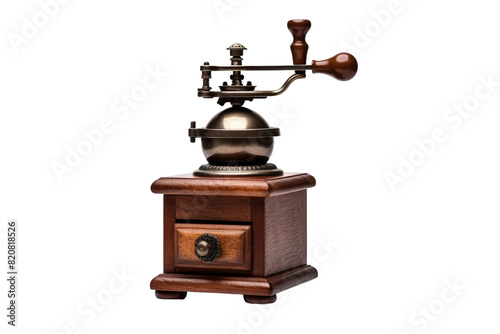 The Timeless Dance of Aroma: Vintage Coffee Grinder on Wooden Stand on a White or Clear Surface PNG Transparent Background.