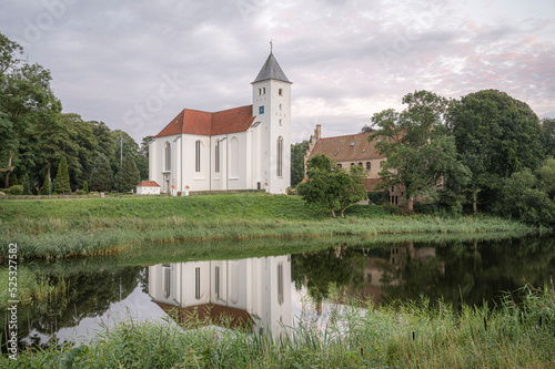 reflect, vegetation, green, cloudy, dusk, rural, destination, reflexion, evening, reflected, scandinavia, water, sky, architecture, denmark, church, travel, landmark, tower, old, landscape, religion, view, lake, blue, gothic, exterior, danish, cloud, attraction, nature, abbey, abbey church, jutland