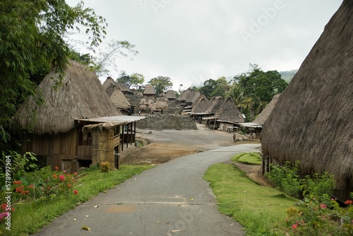 The traditional Bena Village on Flores, in the center a path leading to the village center square, on the left and right several cone-shaped thatched huts, in the background trees.