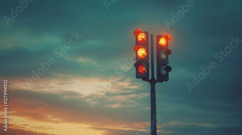 sky, light, traffic, evening, road, dark, cloud, stop, signal, urban, travel, transportation, light, city, street, pole, red, orange, green, night, colours, safety, weather, time, twilight, journey, background, abstract, scenic, dusk, direction, warning, calm, movement, view, horizon, up high, structure, pattern, metallic, electricity, danger, infrastructure, technology, signs, position, minimalist, simple