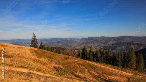 The trail to the Pilsko mountain from the Glinne pass. The season of autumn, called the "golden autumn". A beautiful sunny day in October.